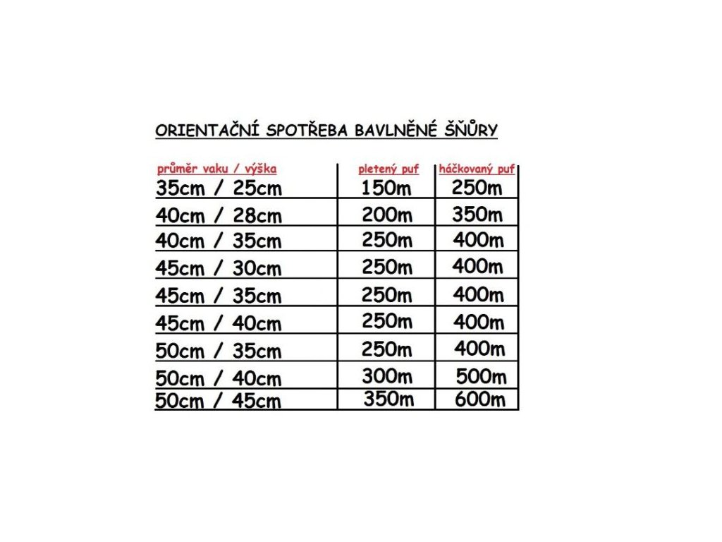 Spotřeba: ze 100 m šňůry uděláte přibližně čtverec 40x40cm (háček č.10).