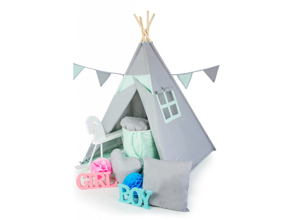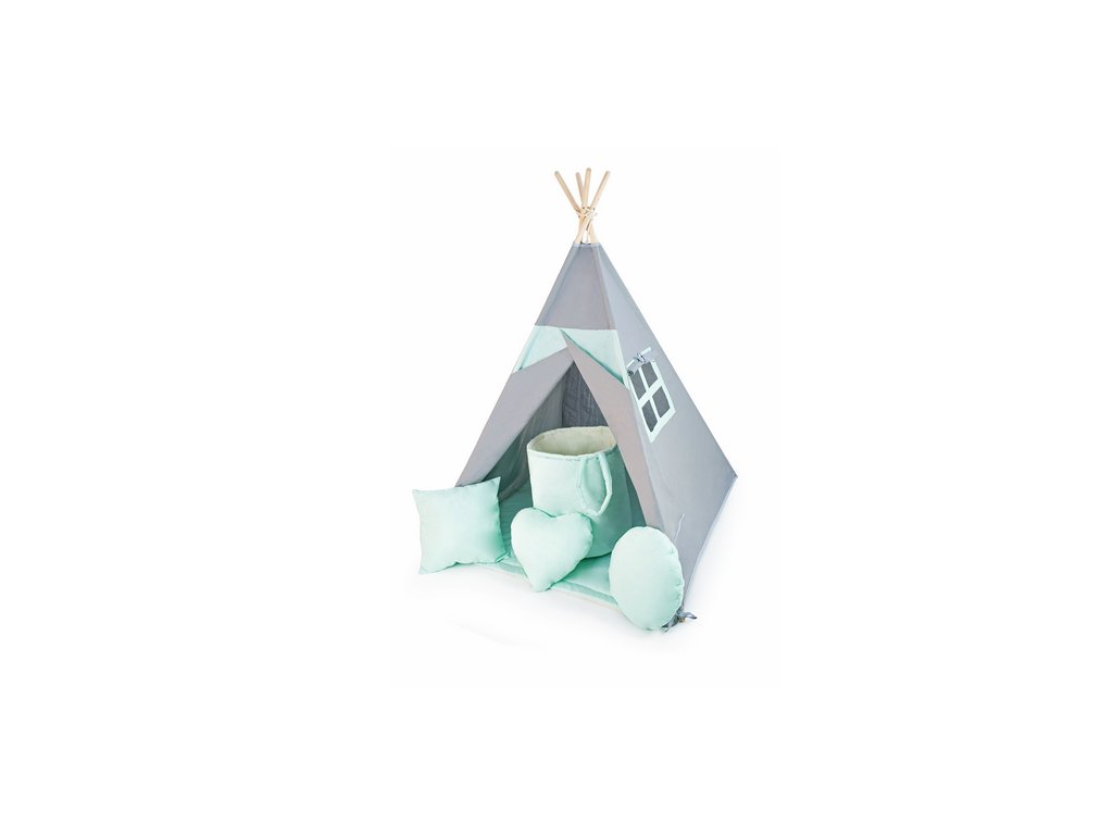 Dětské týpí s vybavením - šedé/mint KOMPLETNÍ SADA