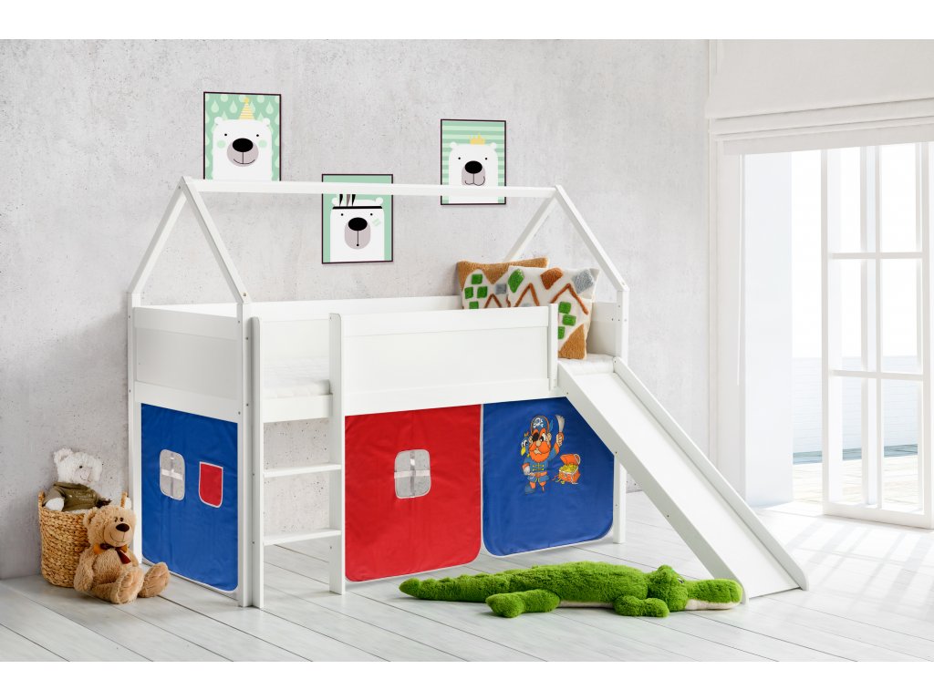 Dětská vyvýšená postel se skluzavkou z masivu borovice DOMEK bílá - červenomodrý PIRÁT