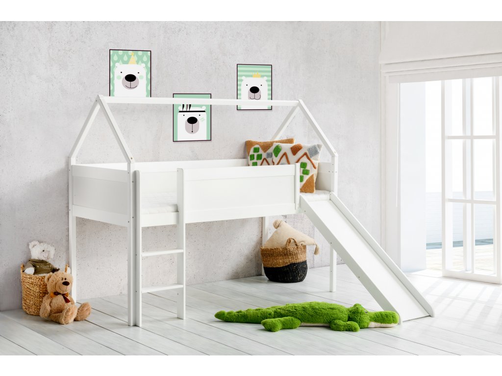 Dětská vyvýšená postel se skluzavkou z masivu borovice DOMEK bílá