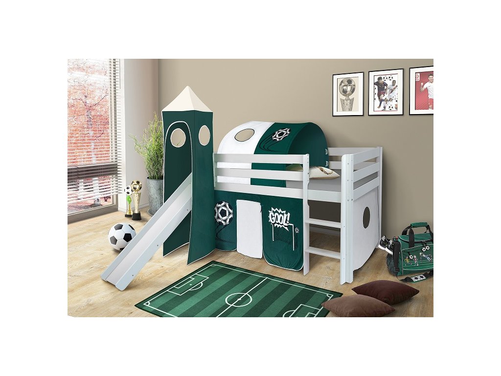 Dětská vyvýšená postel se skluzavkou z masivu borovice - fotbal - BÍLÁ
