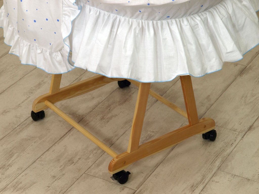 - proutěný koš, podvozek s kolečky, nebesa, držák nebes, peřina 75x75cm, polštář 35x40cm, povlečení na polštář a peřinu, matrace molitan s froté úpravou, zábrana okolo koše.