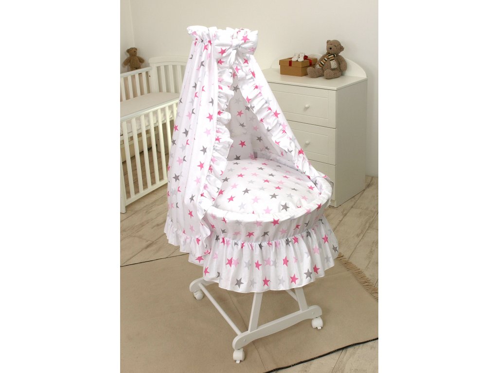 Proutěná postýlka BÍLÁ - růžovo šedé hvězdy