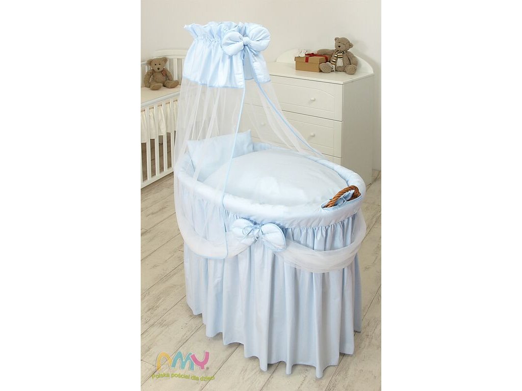 - proutěný koš,  podvozek s kolečky, nebesa, držák nebes, peřina 75x75cm, polštář 35x40cm, povlečení na polštář a peřinu, matrace molitan s froté úpravou, zábrana okolo koše.