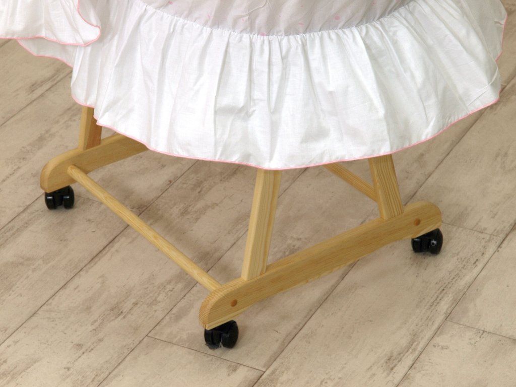 - proutěný koš,  podvozek s kolečky, nebesa, držák nebes, peřina 75x75cm, polštář 35x40cm, povlečení na polštář a peřinu, matrace molitan s froté úpravou, zábrana okolo koše.