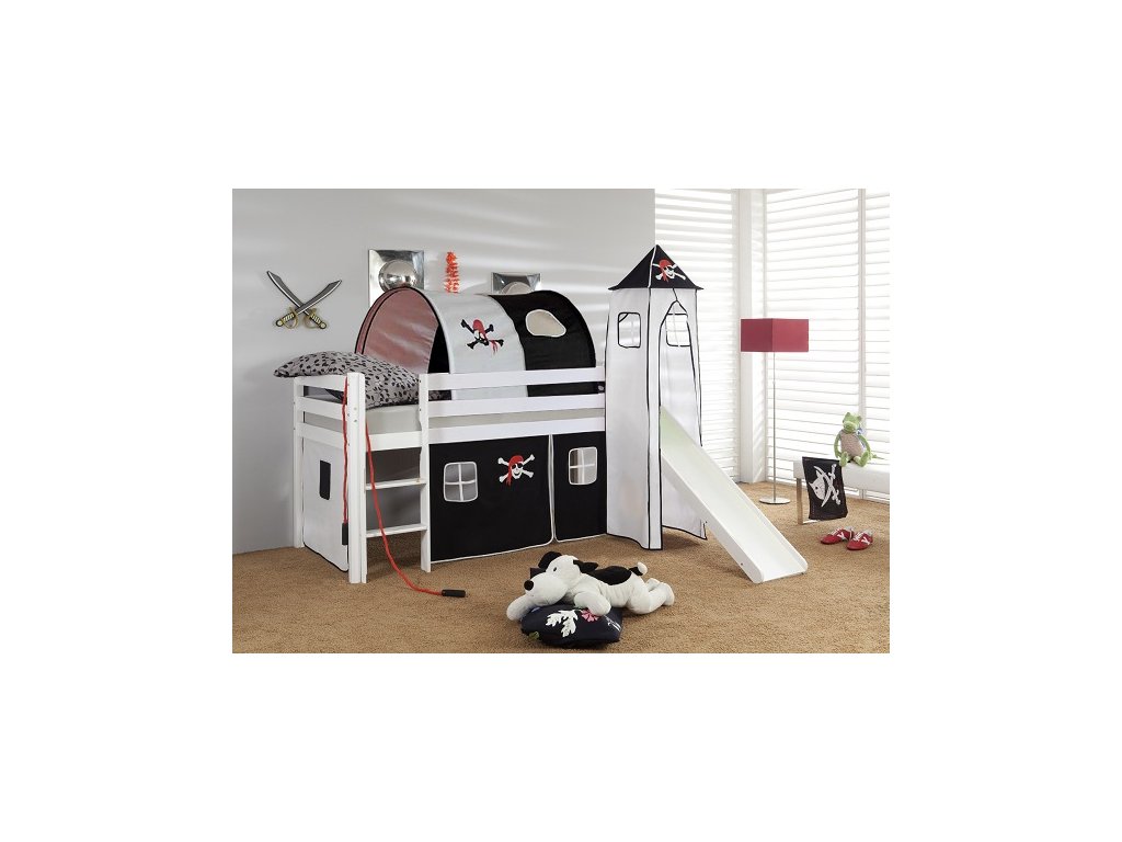 Dětská vyvýšená postel se skluzavkou z masivu borovice - černo bílý pirát - bílá